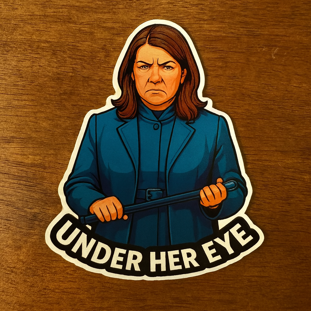 Meet Aunt Marlaina—a sharp, satirical send-up of Alberta’s book-banning politics, styled after the infamous enforcers from Margaret Atwood’s The Handmaid’s Tale. This matte, contour-cut vinyl sticker (approx. 3" wide × 3.5" tall) is weatherproof and ready for laptops, water bottles, guitar cases, and protest placards alike.